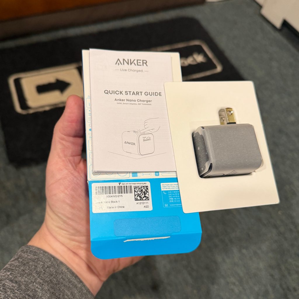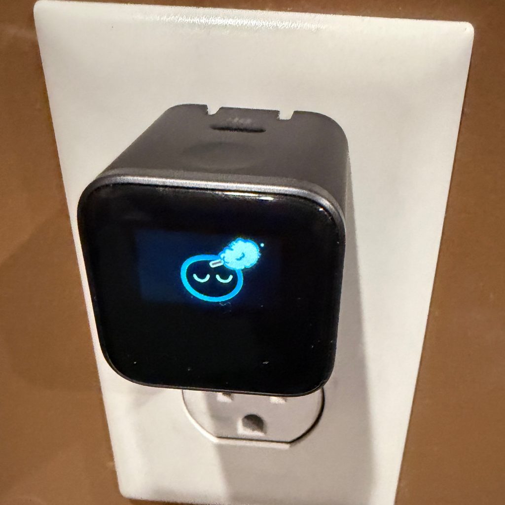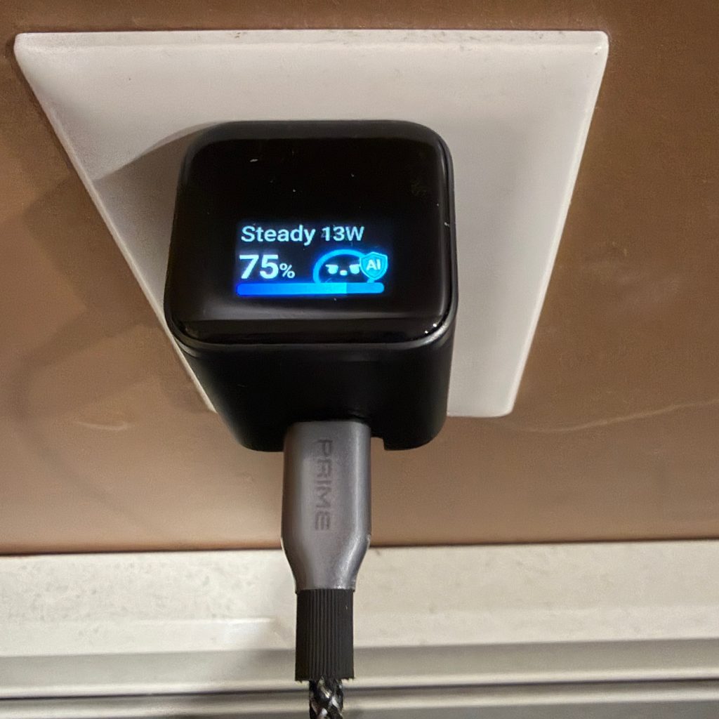 • There’s an animated color display with a basic tap-based (not touchscreen) user interface. This charger doesn’t just provide a readout of the wattage being output, it identifies most recent iPhones and iPads**, lets you see what percentage of the battery is charged, and it allows you to choose whether to charge the device quickly or on a slower curve that keeps the battery and charger cooler, which could prolong battery lifespan.The display also has an animated smiley face, which is charming, and AI badging which is ridiculous. I’m not clear if “AI” refers to Anker having used machine learning to identify the devices that are plugged in, or the three-stage charging curve it uses, or something else entirely, but adding “AI” to the display is not adding value.