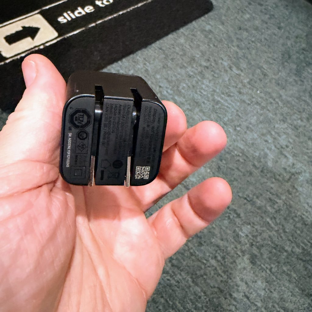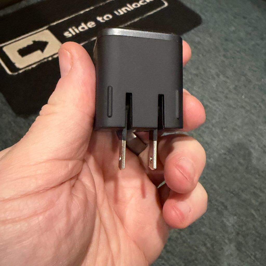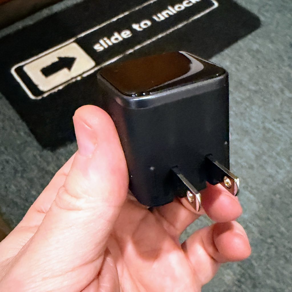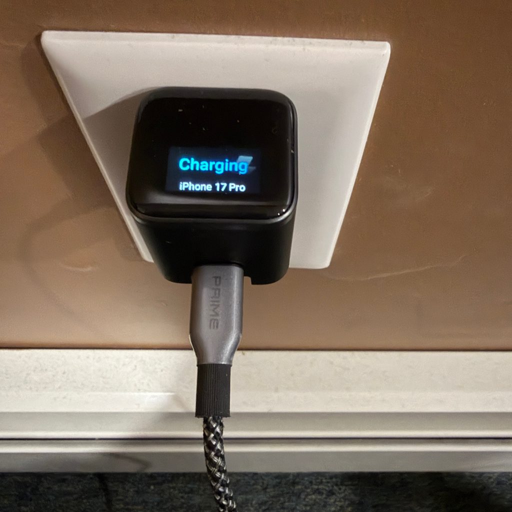 • There’s an animated color display with a basic tap-based (not touchscreen) user interface. This charger doesn’t just provide a readout of the wattage being output, it identifies most recent iPhones and iPads**, lets you see what percentage of the battery is charged, and it allows you to choose whether to charge the device quickly or on a slower curve that keeps the battery and charger cooler, which could prolong battery lifespan.The display also has an animated smiley face, which is charming, and AI badging which is ridiculous. I’m not clear if “AI” refers to Anker having used machine learning to identify the devices that are plugged in, or the three-stage charging curve it uses, or something else entirely, but adding “AI” to the display is not adding value.